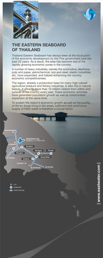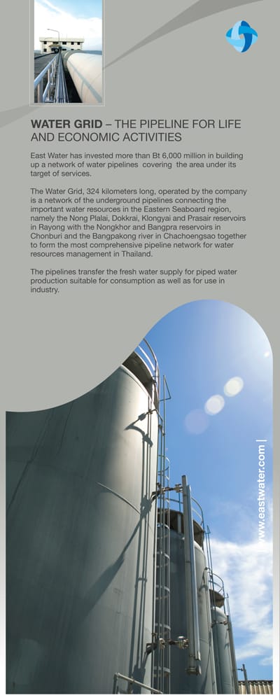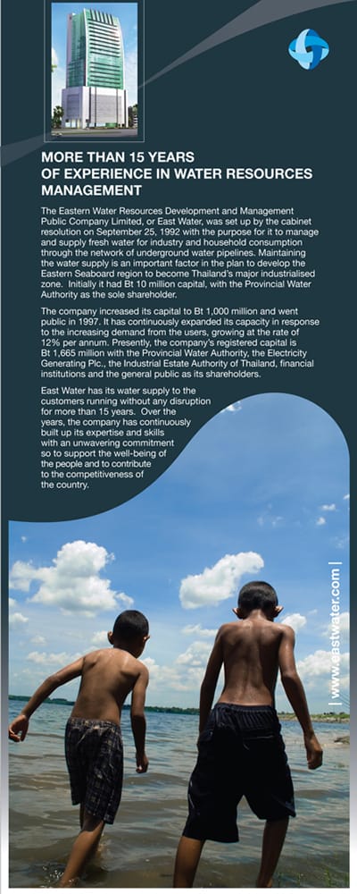 East Water or Eastern Water Resources Management and Development Plc (SET: EASTW) was established by a cabinet resolution in 1989 to be responsible for the supply of raw water to the Eastern Seaboard, a region fast becoming the hub of heavy industries in Thailand. For more than 15 years of operation, East Water has been supply water to sustain life and economic activities without disruption.